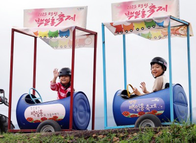 내년을 기약하며 깡통열차 타고 백일홍 꽃밭 즐기는 방문객