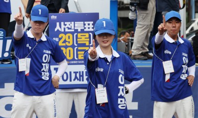 이재명 더불어민주당 대선 후보 지지자 앞에 선 선거유세단
