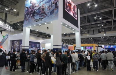 전시부스 둘러보는 박윤규 정보통신산업진흥원 원장-설재진 과기부 디지털콘텐츠과장
