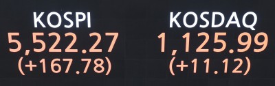 코스피 2.72% 상승 5499...코스닥 1.07% 상승 1126 거래중