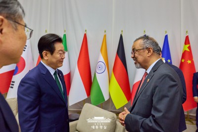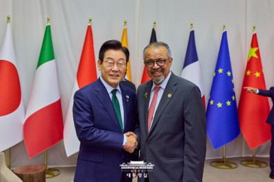 남아프리카공화국에서 만난 이재명 대통령 - 테워드로스 아드하놈 거브러여수스 WHO 사무총장