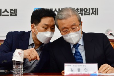 대화 나누는 김종인 총괄선대위원장 - 김기현 공동선대위원장