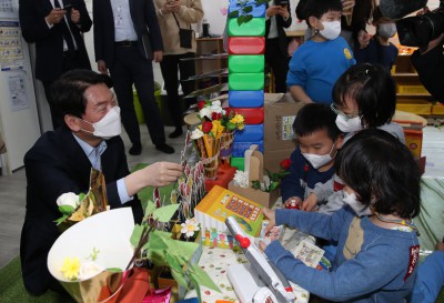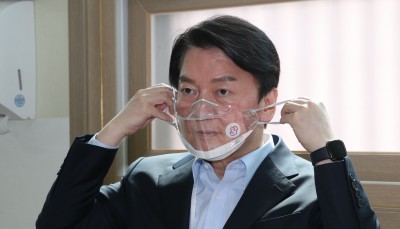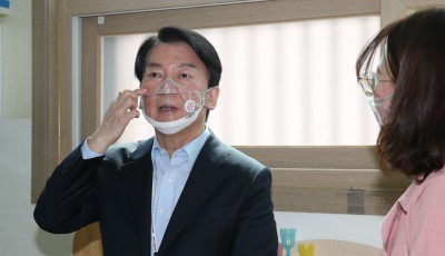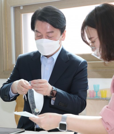 '어린이 언어교육 발달용' 투명마스크 써보는 안철수 인수위원장