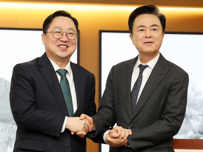 '행정통합' 회동서 악수하는 이장우 대전시장·김태흠 충남지사