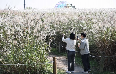 내년을 기약하며 깡통열차 타고 백일홍 꽃밭 즐기는 방문객