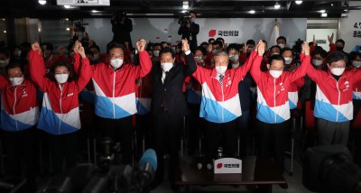 '서울-부산시장 출구조사 전부 우세' 환호하는 국민의힘