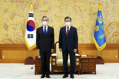 [영상] 文, 왕이 외교부장 접견…"中 변함없는 지지 기대"