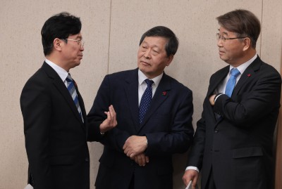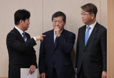대화하는 김영훈 고용부 장관 - 박수근 중노위 위원장 - 김지형 경사노위 위원장