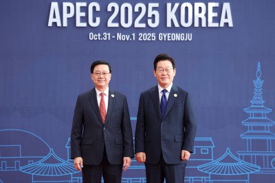 존 리 홍콩 행정장관과 기념 사진 촬영하는 이재명 대통령