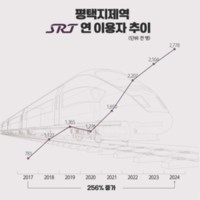 평택지제역 SRT 이용객 2017년 이후 256% 증가 [평택=뉴스핌] 이성훈 기자 = 경기 평택지제역의 SRT 이용객 수가 2017년 78만 명에서 2024년 278만 명으로 256% 증가한 것으로 조사됐다. 13일 시에 따라면 SRT 역사 중 가장 높은 이용자 증가율을 기록하며, 연간 이용객 순위도 11위에서 7위로 상승했다. 평택지제역 SRT 이용객 추이 그래프[사진=평택시] SRT는 2016년 12월 서울 수서역을 기점으로 개통한 고속열차로 평택지제역은 개통 초기부터 정차역으로 포함되어 매년 이용객이 꾸준히 늘고 있는 상태다. 이용객 증가는 고덕국제신도시 등 신도시 개발과 삼성전자 등 대규모 기업 유치가 이용객 증가의 주요 원인이라고 분석된다. 이에 시는 앞으로 KTX 정차(2026년), GTX-A(2028년), GTX-C(2030년) 운행이 예정되어 있어 이용객 수는 더욱 늘어날 것으로 전망하고 있다,. 시 관계자는 "평택지제역을 미래형 복합환승센터로 개발할 계획"이라며 "이곳에는 철도와 버스 연계를 넘어 자율주행차, 전기 수소차 등 미래 모빌리티를 아우르는 교통 허브로 조성될 예정"이라고 전했다. krg0404@newspim.com 25-10-13 14:04