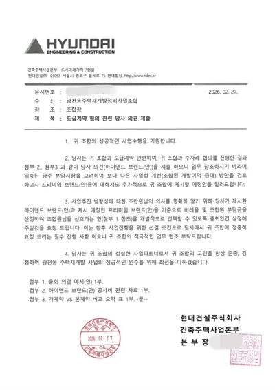 '디에이치' 미분양 부담…현대건설, 광주 광천동 조합에 프리미엄 '포기' 제안 [서울=뉴스핌] 정영희 기자 = 광주광역시 최대 재개발 사업지로 꼽히는 광천동 재개발 구역에 시공사인 현대건설이 하이엔드 브랜드 '디에이치(THE H)' 대신 새로운 프리미엄 브랜드 적용을 제안했다. 지역 부동산 시장의 극심한 침체와 공사비 상승으로 조합원 분
