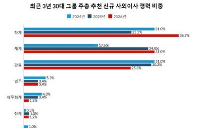 30대 그룹 신규 사외이사, 재계 출신 관료 첫 역전 [서울=뉴스핌] 서영욱 기자 = 국내 30대 그룹이 3월 주주총회를 앞두고 추천한 신규 사외이사에서 재계 출신 비중이 관료 출신을 앞질렀다. 기술 분야 전문성도 확대됐다. 3일 기업분석연구소 리더스인덱스에 따르면 30대 그룹 계열사 157곳이 제출한 2026년 주주총