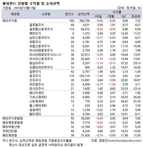 19일 펀드평가사 제로인에 따르면 17일 아침 공시된 기준 가격으로 펀드 수익률을 조사한 결과 해외 주식형 펀드는 한주동안 0.93% 하락했다.