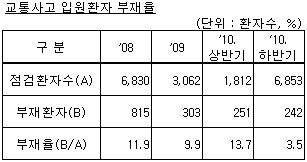 점검결과 교통사고 입원환자의 부재율이 3.5%로 상반기(13.7%) 대비 대폭 개선(10.2%p 감소)했으며, 합동점검이 실시된 2010년 10월의 교통사고 입원환자 1인당 입원기간이 평균 5.0일로 전월(7.7일)대비 크게 감소한 것으로 나타났다.