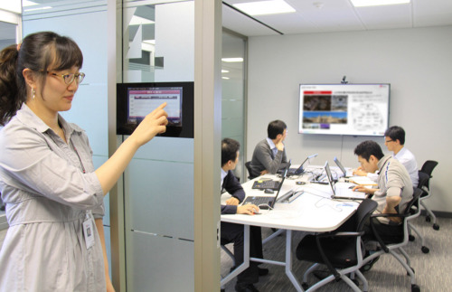 회의실에는 터치형 예약 단말기인 ‘e-Note’를 설치해 활용도를 높였으며, 회의실 벽면에는 유리재질의 대형 보드를 빌트인 형태로 설치, 회의 중 아이디어와 의견을 자유롭게 펼칠 수 있도록 했다. 벽면이 자유롭게 움직여 회의 성격에 따라 구조를 변형할 수 있다.