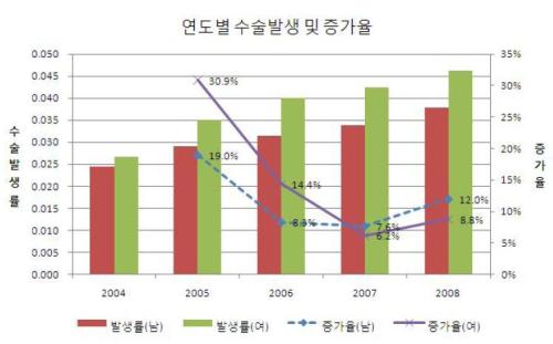 실제로 보험개발원에 따르면 지난 2004~2008년 생명보험 가입자 중 매년 평균 남자는 11.6%, 여자 14.7%씩 수술이 늘어난 것으로 나타났다.