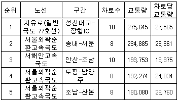 노선별 교통량은 자유로(일반국도77호선, 성산대교-장항IC)의 교통량이 하루 약 27.6만대로 가장 많았으며, 1개 차로당 교통량이 가장 많은 노선은 서울외곽순환 고속국도(송내-서운)로 조사됐다.