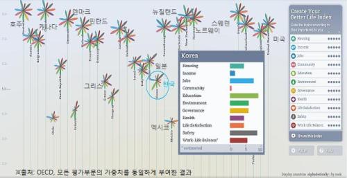 이번에 개시한 OECD의 행복지수는 34개 회원국 모두를 주택, 소득, 일자리, 공동체, 교육, 환경, 지배구조, 건강, 삶의 만족도, 안전 그리고 일과 삶의 균형 등 총 11개 영역에 대한 점수를 매겨 도출된다.