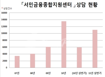 같은기간 서민금융 관련 전체 상담건수는 1만1073건으로 전년동기(5952건)대비 86%나 증가했다(도표 참조). 이는 햇살론과 새희망홀씨 등 서민대출 시행에 따른 제도상담이 크게 증가했기 때문으로 분석된다. 실제로 서민대출관련 상담건수는 지난해 상반기 2921건에서 올해 같은 기간 7455건으로 두 배 이상 급증했다.