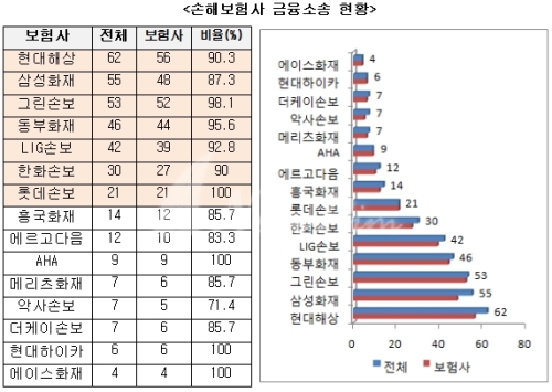 손해보험사가 고객을 상대로 소송을 제기한 비율을 보면, 롯데손보와 AHA, 에이스화재, 현대하이카 등이 100%로 가장 심각했으며, 그린손보(52건,98%)와 동부화재(44건,95.7%), LIG손보(39건,92.9%)도 업계 평균(91.5%)를 웃돌았다.