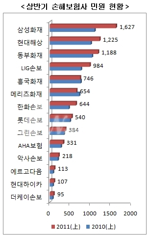 보험사별로는 대부분 주요 보험사들이 두 자릿수 증가율을 기록한 가운데 업계 1위인 삼성화재가 1627건으로 47.5%나 급증하면서 민원 역시 업계 1위를 고수했다.