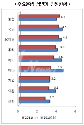 반면 신한은행은 같은 기간 3.2건에서 2.7건으로 낮춰 은행권에서 가장 낮은 수준을 유지했으며, 외환은행(3.1건)과 기업은행(3.2건)도 상대적으로 낮은 수준을 기록했다.