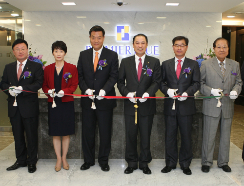 | 우리투자증권 황성호 대표가(우측3번째) 프리미어 블루 강북센터 오픈식에서 테이프 커팅을 진행하고 있다. |