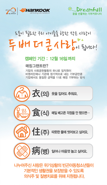 [뉴스핌=김기락 기자] 한국타이어가 다음달 16일까지 온라인 기부 사이트 ‘드림풀’을 통해 매칭그랜트 방식의 ‘Dream Together, 드림 2배 더’ 캠페인을 실시한다고 22일 밝혔다.