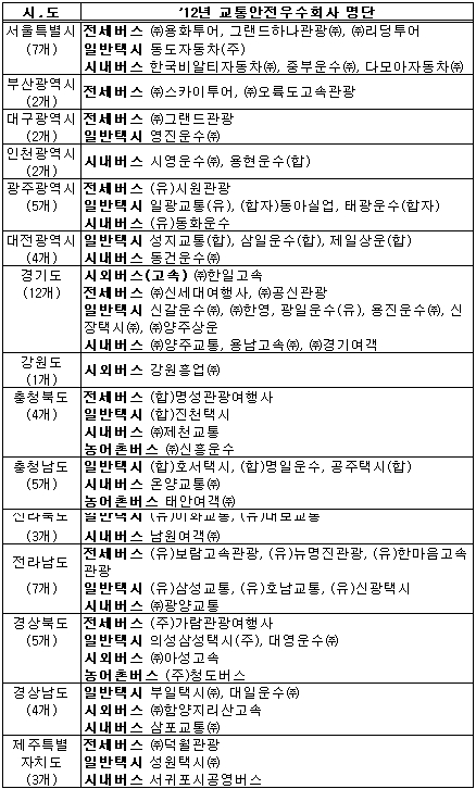우수회사로 선정된 회사는 앞으로 시·도에서 실시하는 2012년도 교통안전점검을 면제받게 되고, 내년 1월부터 12월까지 차량전면에 '2012년도 교통안전우수회사' 마크를 부착·운행하게 된다.