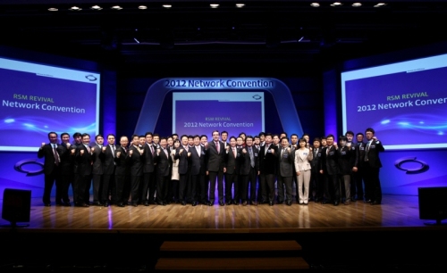 | 12일 서울 대한상공회의소에서 열린 르노삼성자동차의 `2012 영업본부 발대식`에서 프랑수아 프로보 사장(가운데)과 임원진, 영업본부 임직원들이 2012년 목표 달성을 위한 결의를 다지고 있다. |