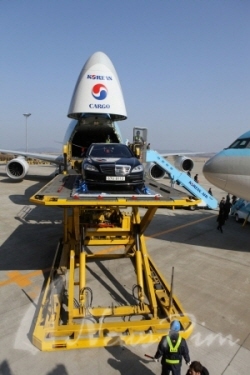 | ▲ 대한항공은 지난 14일 인천공항에서 B747-8F,B777F 화물기 도입 행사를 했다. 사진은 하역 시연을 하는 모습. |