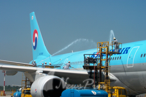 | ▲ 대한항공 정비사들이 항공기를 세척하고 있는 모습. |