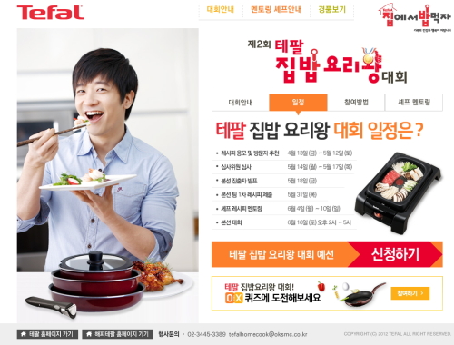 특히, 이번 대회에서는 요리대회 참가자는 물론 온라인 사이트 방문자들에게도 푸짐한 이벤트와 선물이 마련되어 있다. ‘테팔 집밥 요리왕 대회 온라인 사이트 (www.tefalhomecook.com)’ 에는 평소 테팔 브랜드에 관심을 가지고 있는 방문자라면 누구나 도전해 볼 만한 OX 퀴즈가 준비되어 있다.