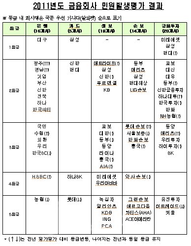금융감독원은'2011년도 금융회사 민원발생평가'를 실시하고 은행, 신용카드, 생명보험, 손해보험, 금융투자 등 5개 권역 74개사의 평가결과를 19일 공표했다.