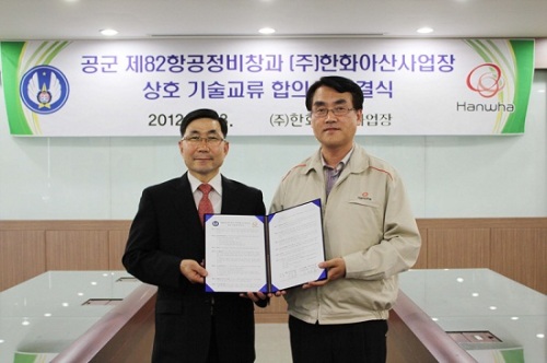 [뉴스핌=배군득 기자] ㈜한화(대표이사 심경섭)는 3일 충남 아산사업장에서 공군 제82항공정비창과기술교류 협정체결식을 가졌다.