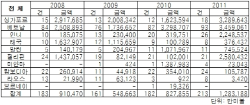 우리 건설업계의 아세안 지역 건설 수주는 지난해 128억3188만 달러로 최대치에 올랐으나 올해는 5월 현재 71건 수주에 20억6332만달러로 지난해에 다소 못미치고 있다.