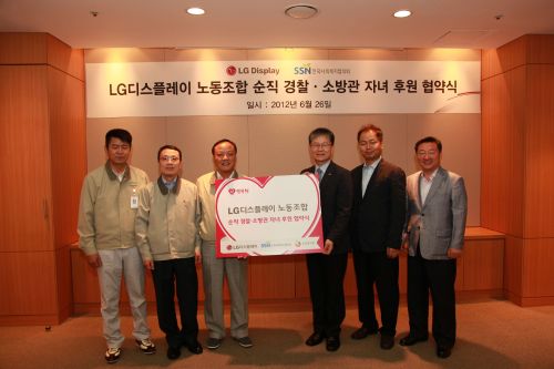 [뉴스핌=장순환 기자] LG디스플레이(대표이사 한상범, 韓相範)는 지난 26일 오후, 파주공장에서 석호진 노조위원장을 비롯한 회사 임직원들과 한국사회복지협회회, 소방재난본부 및 경찰청 관계자 등이 참석한 가운데, '순직 경찰 소방관 자녀 후원 협약식'을 가졌다고 밝혔다.