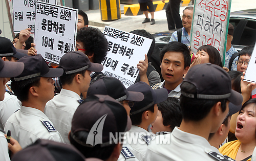 [뉴스핌=김학선 기자] 반값등록금 국민운동본부와 21세기 한국대학생연합이 3일 오후 서울 여의도 국회의사당 앞에서 열린 반값등록금 실현 촉구 기자회견을 마치고 박근혜 새누리당 대통령 후보와의 면담 요청을 위해 당사로 들어가려 하자 경찰들이 제지하고 있다.