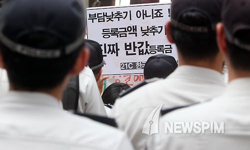 [뉴스핌=김학선 기자] 반값등록금 국민운동본부와 21세기 한국대학생연합이 3일 오후 서울 여의도 국회의사당 앞에서 열린 반값등록금 실현 촉구 기자회견을 마치고 박근혜 새누리당 대통령 후보와의 면담 요청을 위해 당사로 들어가려 하자 경찰들이 제지하고 있다.