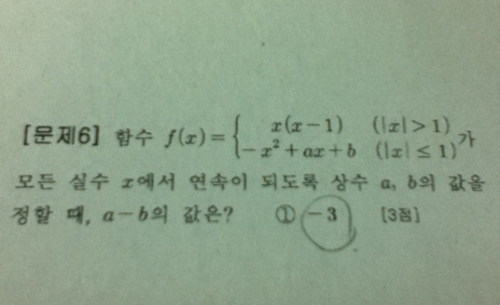 사진 속에는 중학교 수학시험지가 담겨있다. a-b의 값을 찾는 함수문제가 제시된 가운데 답을 선택할 수 있는 보기가 '-3'으로 한개만 주어졌다.