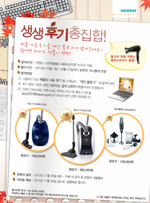 우수 후기 1등 1명에게는 지멘스의 최고급 청소기 Z6를 증정하고 2등 1명과 3등 2명에게는 각각 지멘스 청소기와 핸드블랜더를 증정한다. 그 외 참가자 전원에게는 지멘스 헤어드라이기를 경품으로 제공한다.