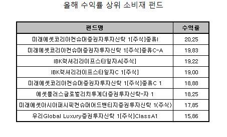 19일 펀드평가업체 에프앤가이드에 따르면 소비재펀드는 올 들어 전날까지 12.81%의 평균 수익률을 기록하고 있다. 국내 주식형(3.83%), 해외 주식형(8.12%)과 비교하면 월등히 높은 수준이다.