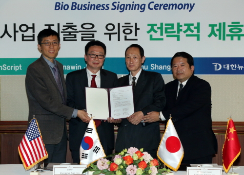 | ▲2일 서울 역삼동 르네상스호텔에서 미국 진스크립트 루콴 왕 회장과 대한뉴팜 배건우 대표, 일본 파마윈 재팬 카수미 세키네 대표, 중국 이토추 상하이 타카히로 마키오 대표(왼쪽부터)가 '프로틴A'에 대한 전락적 제휴를 체결한 후 기념 촬영을 하고 있다. <제공=대한뉴팜> |