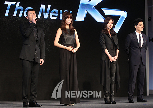 [뉴스핌=최진석 기자] 13일 오전 서울 강남구 역삼동 리츠칼튼호텔 그랜드볼룸에서 열린 기아자동차 '더 뉴 K7' 미디어 쇼케이스에서 배우 장혁이 '더 뉴 K7'을 소개하고 있다. 왼쪽부터 배우 장혁, 이다해, 임수향, 이범수.