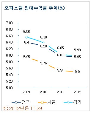 지역별로 서울은 5.5%, 경기는 5.99% 하락해 4년 내 최저 임대수익률을 기록했다.