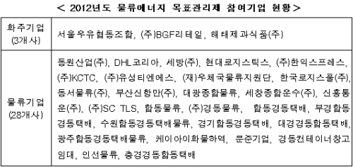 국토해양부는 11일 오후 3시 인터콘티넨탈호텔에서 화주·물류기업 31개사와 '2012년도 물류에너지 목표관리제 협약식'을 체결한다고 10일 밝혔다.