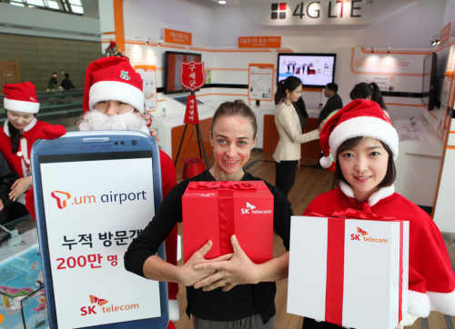 SK텔레콤은 20일 인천공항에서 티움 에어포트 방문객 200만명 돌파 행사를 개최하고, 200만번째 관람객인 미국 국적의 콜린 코이(Colleen Coy : 33세, 여성)씨에게 아이패드 미니 등의 기념품을 증정했다.