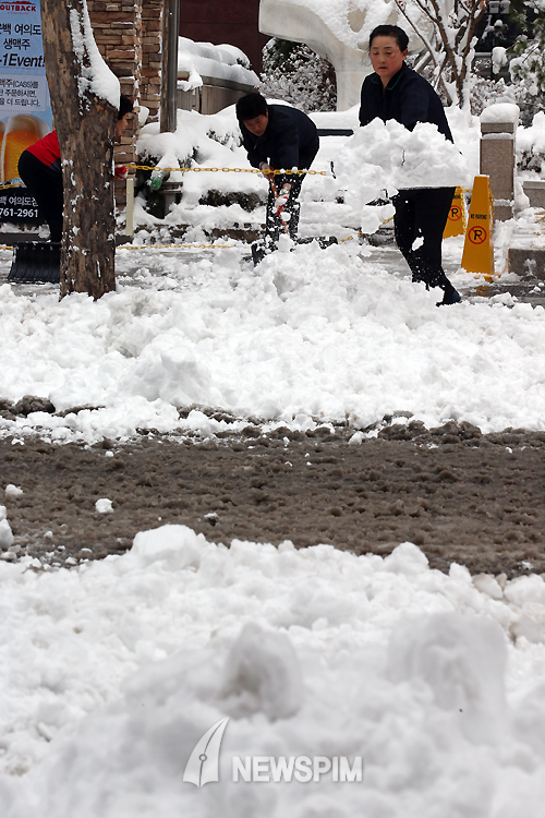 [뉴스핌=김학선 기자] 밤사이 서울지역에 16.5cm의 폭설이 내린 가운데 4일 오전 서울 여의도 수정아파트 앞 사거리에서 시민들이 건물 앞에 쌓인 눈을 치우고 있다.