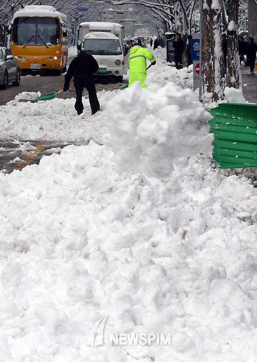 [뉴스핌=김학선 기자] 밤사이 서울지역에 16.5cm의 폭설이 내린 가운데 4일 오전 서울 여의도 수정아파트 앞 사거리에서 시민들이 건물 앞에 쌓인 눈을 치우고 있다.