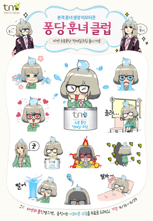 ‘티엔 카카오톡 플러스친구’를 맺으면 네이버에서 연재중인 인기 웹툰 ‘퐁당훈녀클럽’의 익살스런 캐릭터가 들어간 이모티콘 12종 패키지(사진)를 무료로 받을 수 있어 카톡이 일상인 10대들의 큰 인기를 끌고 있으며, 친구와 클럽을 결성하는 것만으로 참여자 전원에게 신제품 ‘티엔 수분 퐁당 칵테일 크림’ 할인쿠폰을 받을 수 있는 기회도 주어진다.